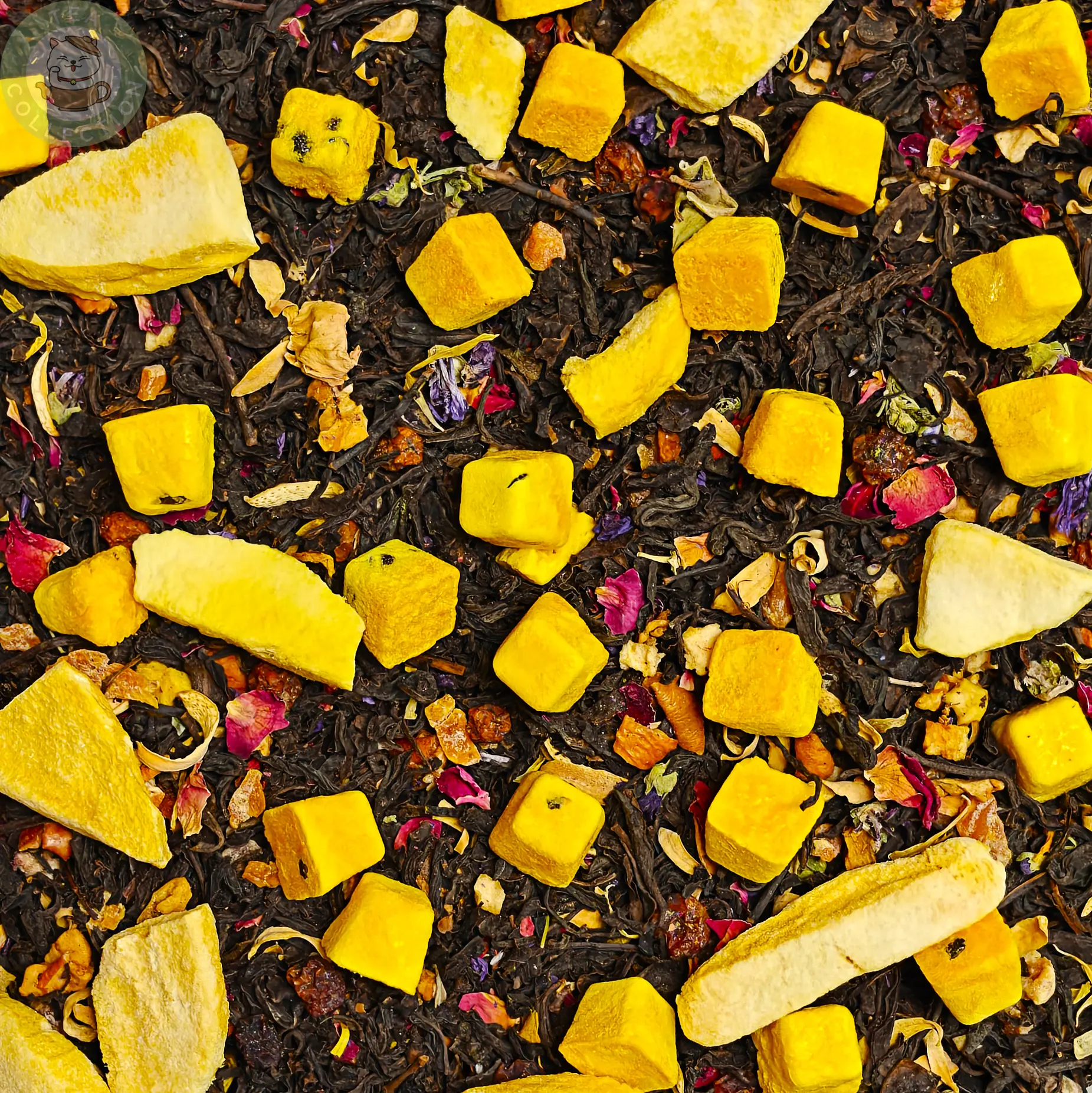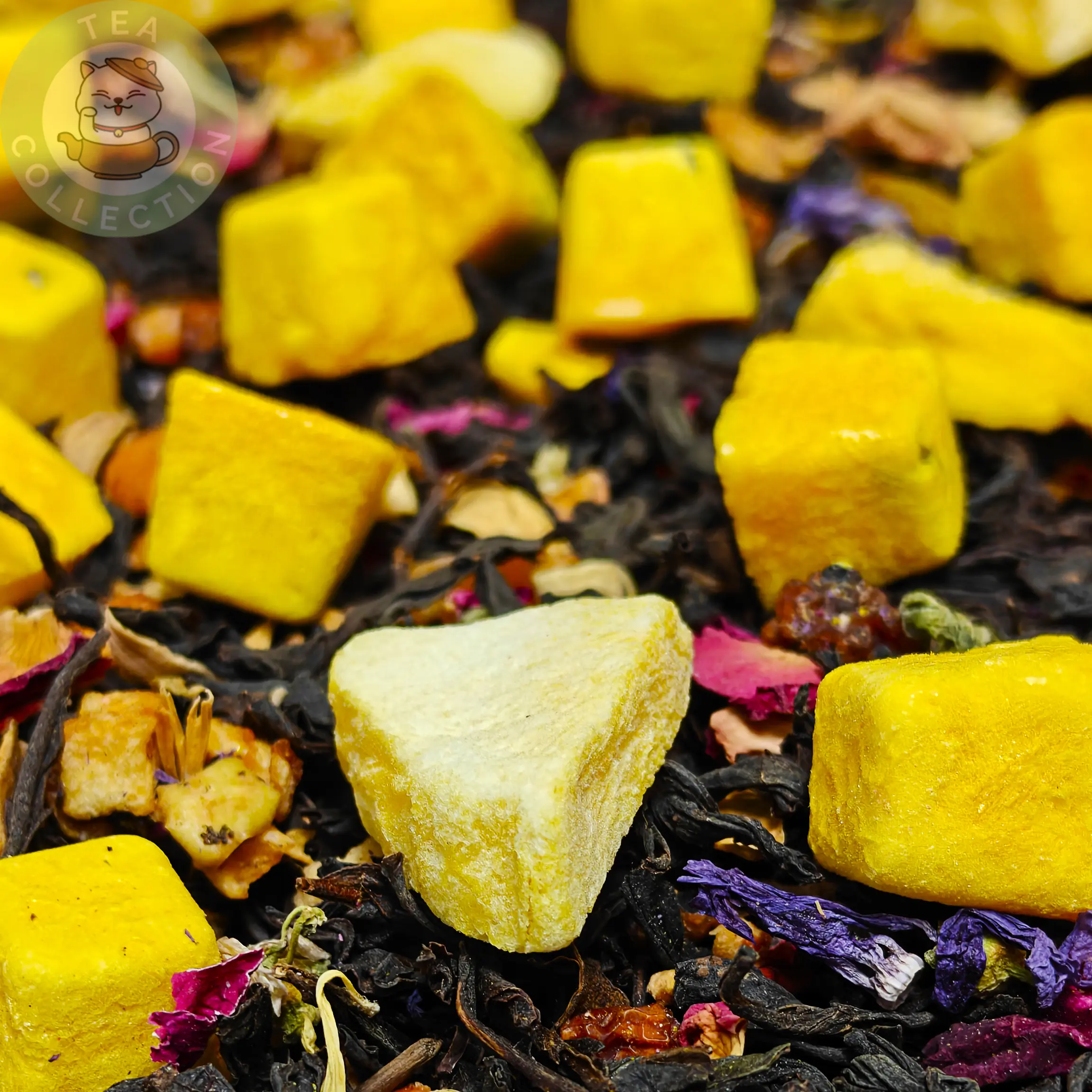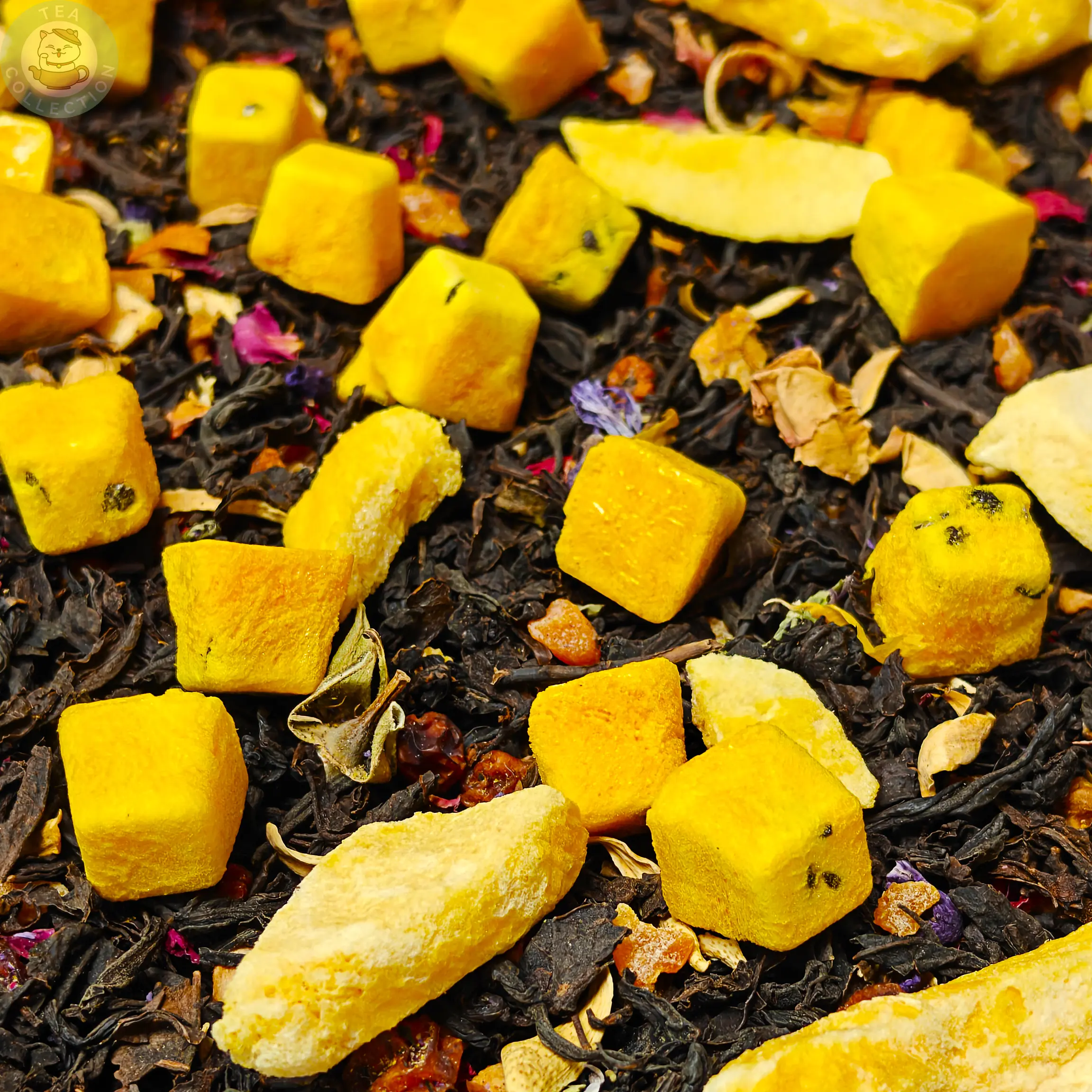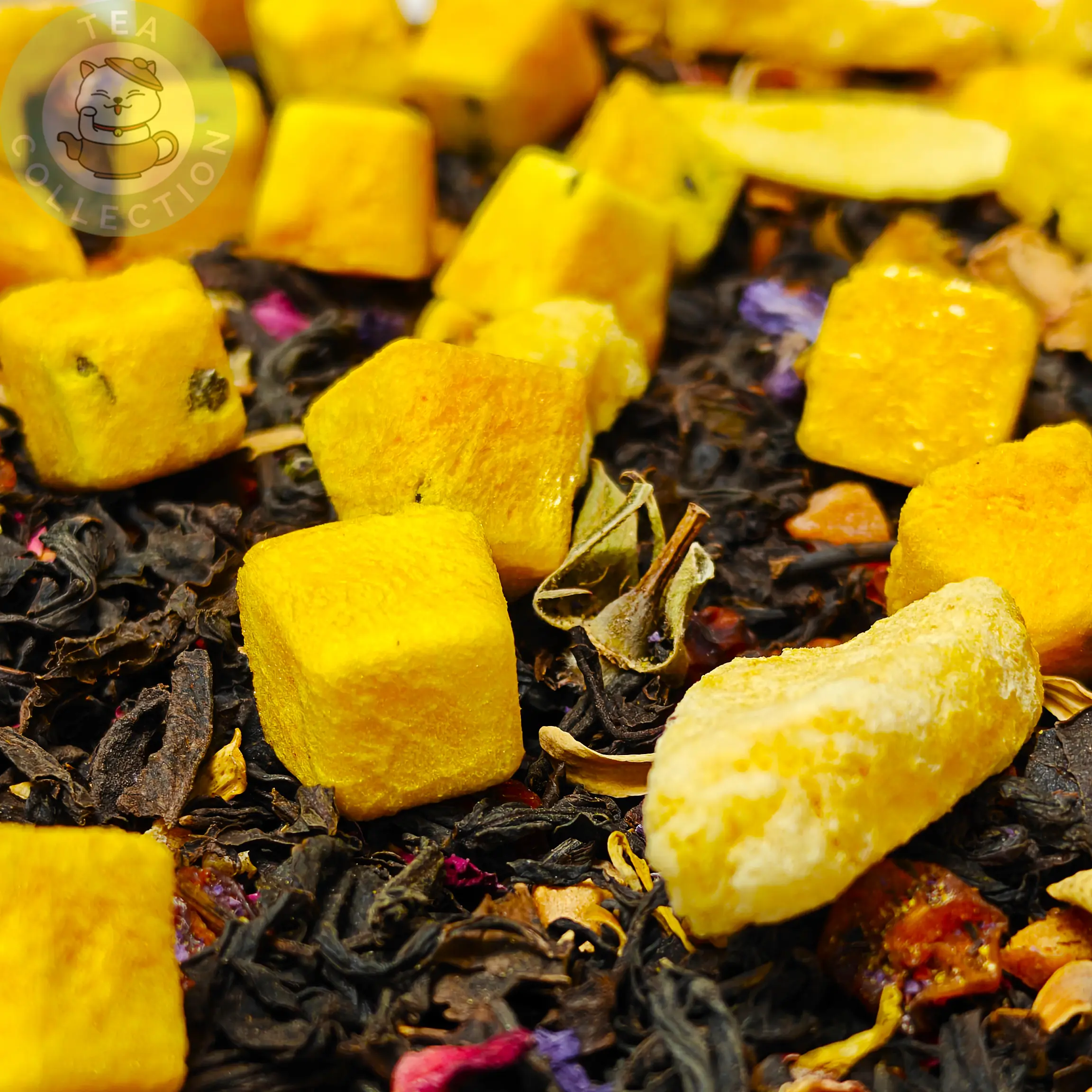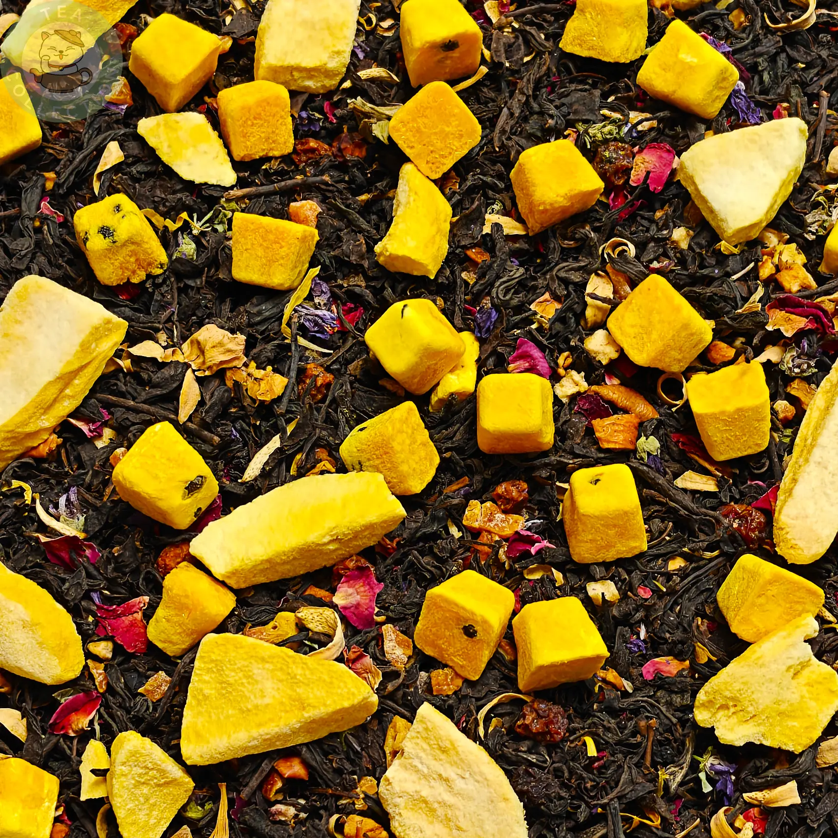 • Манго — придаёт чаю сладость и экзотический аромат. Содержит витамины A, E, С и антиоксиданты, поддерживает здоровье кожи, улучшает пищеварение и помогает справляться с усталостью.